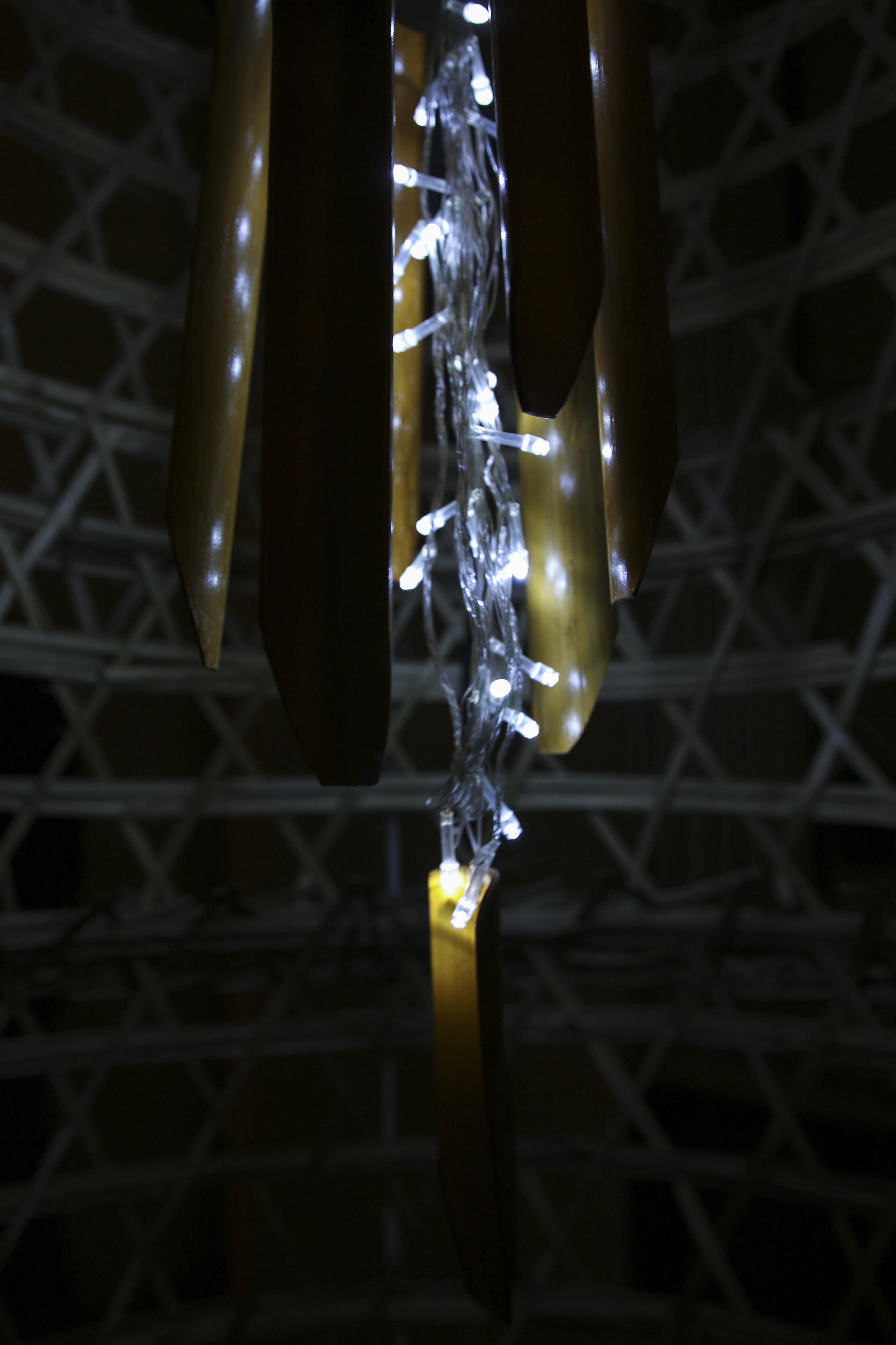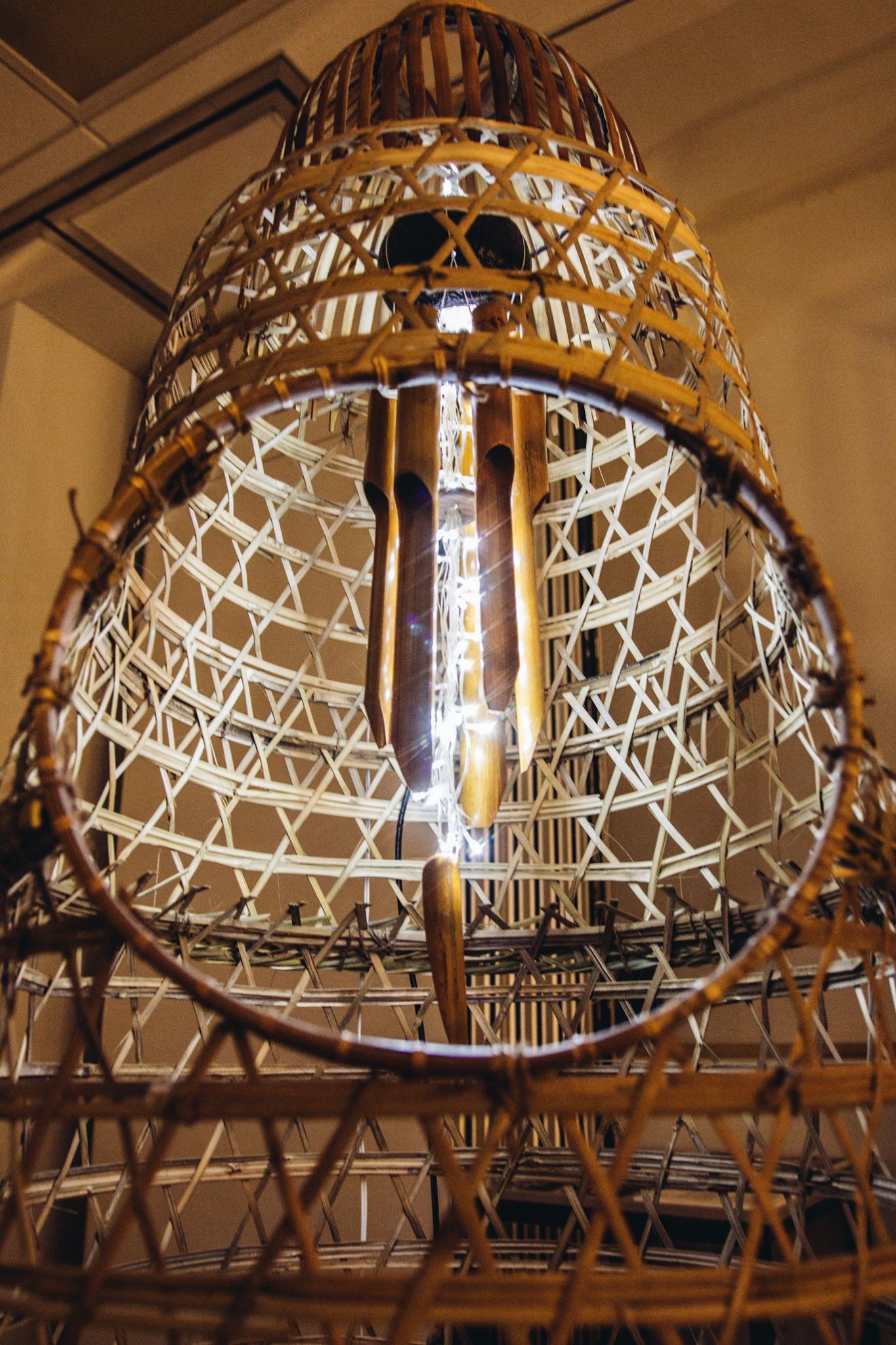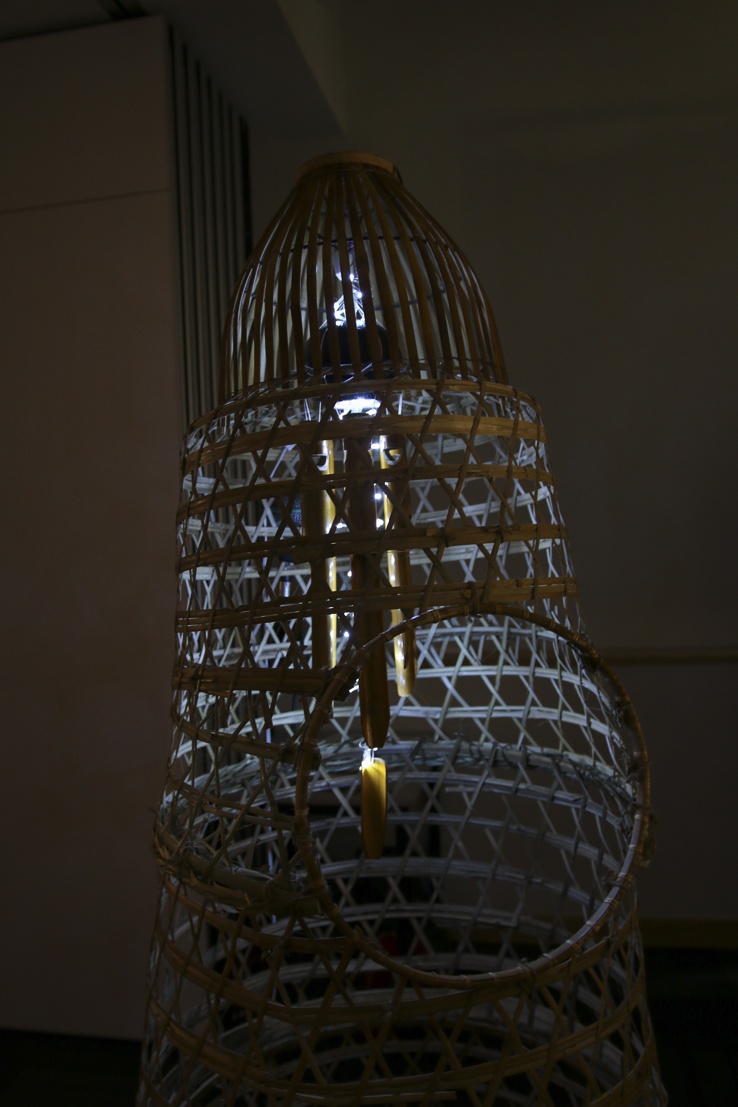 The concept and title stem from the showcase’s theme of ‘the crowd effect’, later titled “Blinded by the Shadow“. Safety in Numbers is an attempt to demonstrate the way in which a crowd can be so easily manipulated. Inspired by horrific events like the Bastille day attack in Nice, the bamboo chimes are shaped to represent humanoid figures forming a crowd. They are gathered within a structure made from bamboo chicken cages and a fish trap, altogether shaped so as to hypothetically cage an entire standing human. An opening is offered to participants to allow them to manipulate the whole crowd with a single flick.