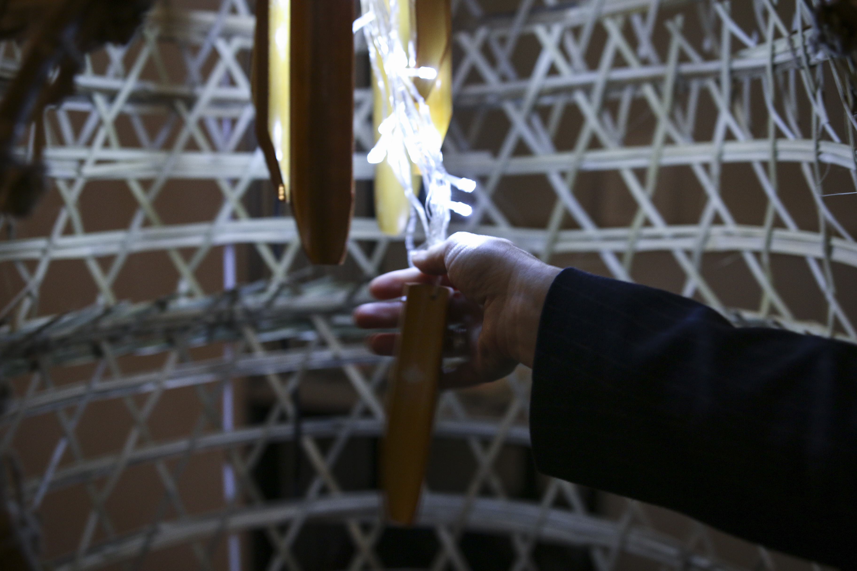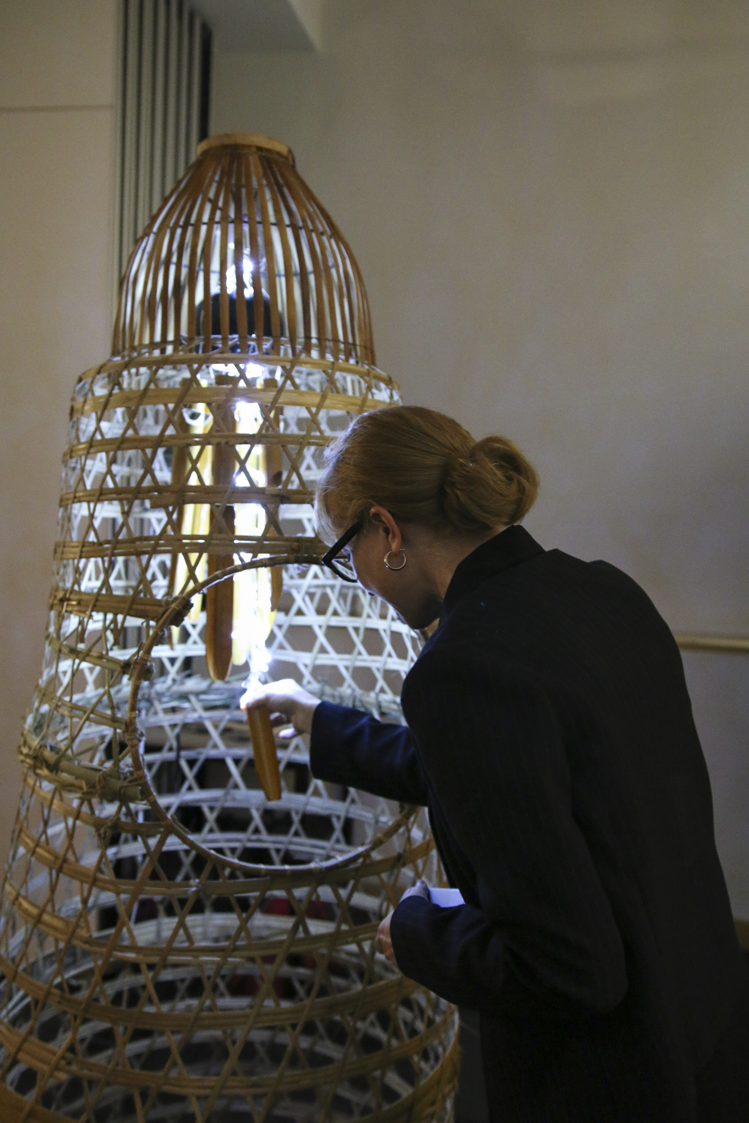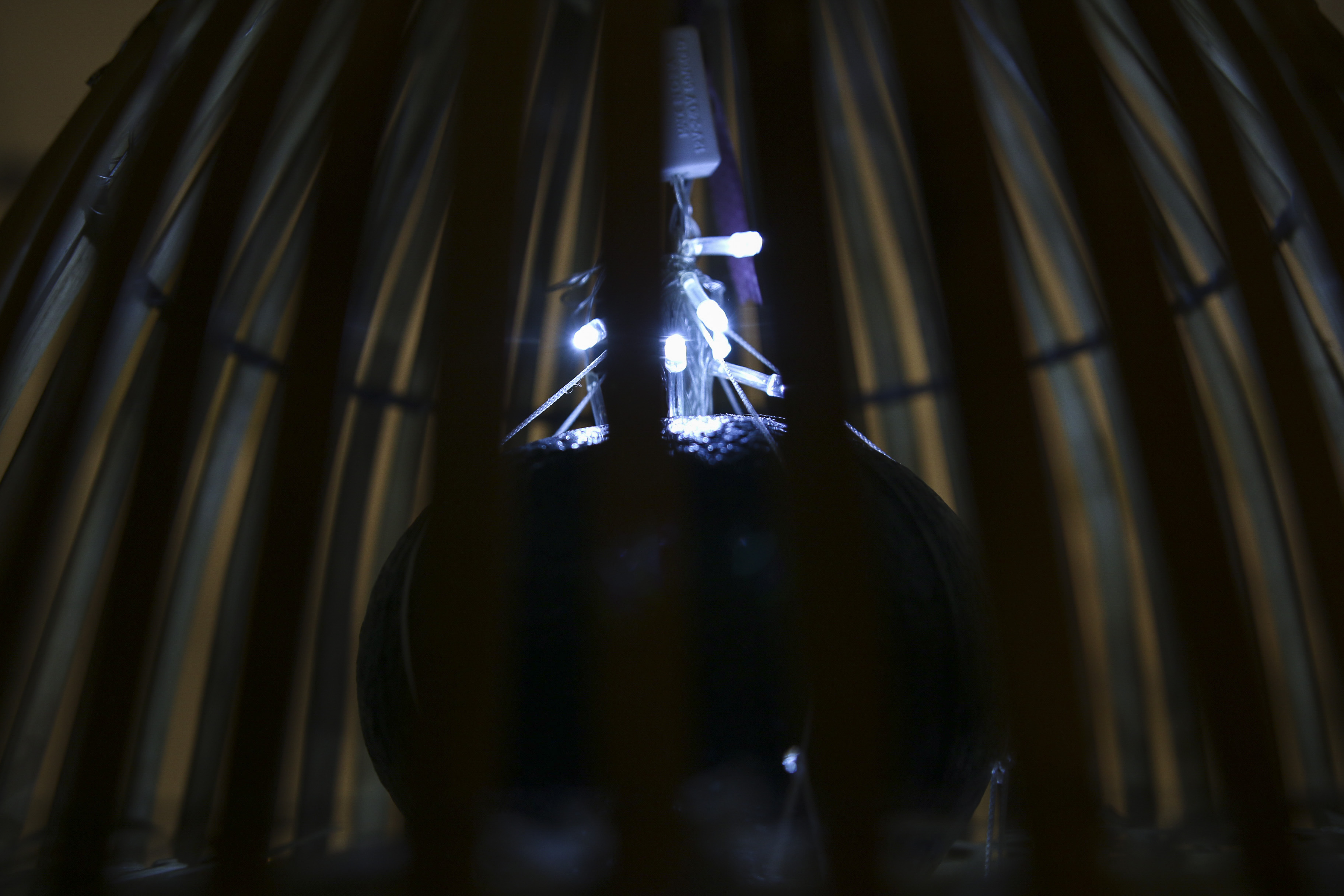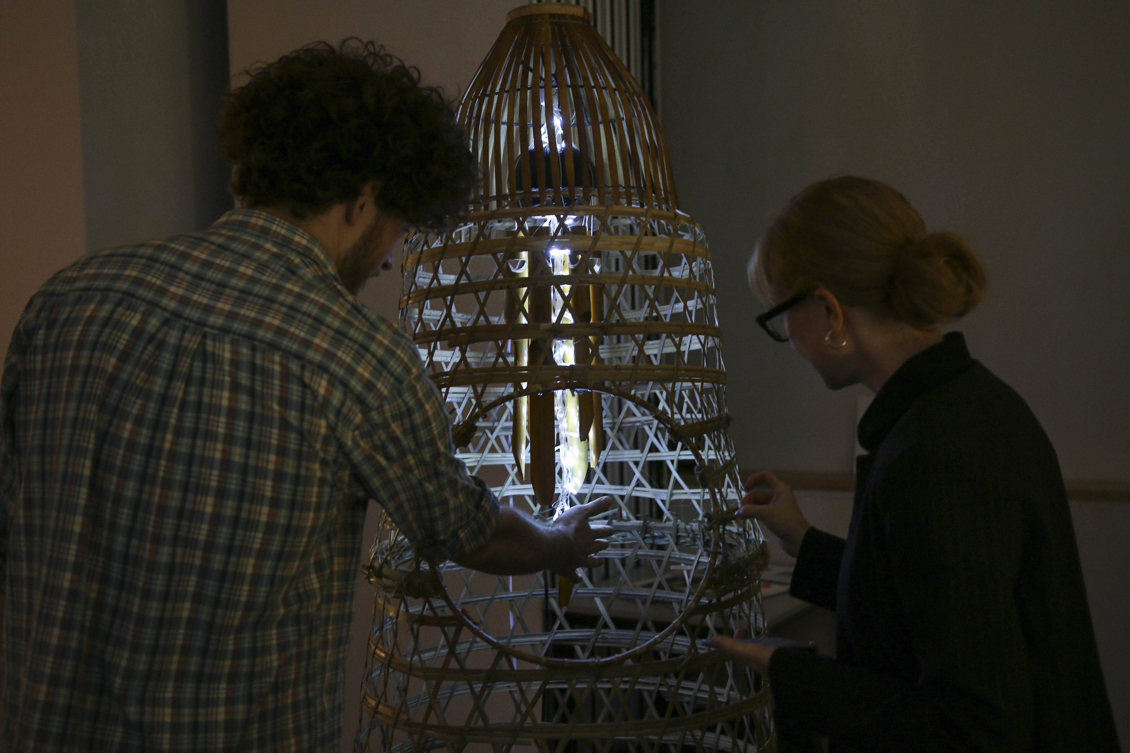 The concept and title stem from the showcase’s theme of ‘the crowd effect’, later titled “Blinded by the Shadow“. Safety in Numbers is an attempt to demonstrate the way in which a crowd can be so easily manipulated. Inspired by horrific events like the Bastille day attack in Nice, the bamboo chimes are shaped to represent humanoid figures forming a crowd. They are gathered within a structure made from bamboo chicken cages and a fish trap, altogether shaped so as to hypothetically cage an entire standing human. An opening is offered to participants to allow them to manipulate the whole crowd with a single flick.