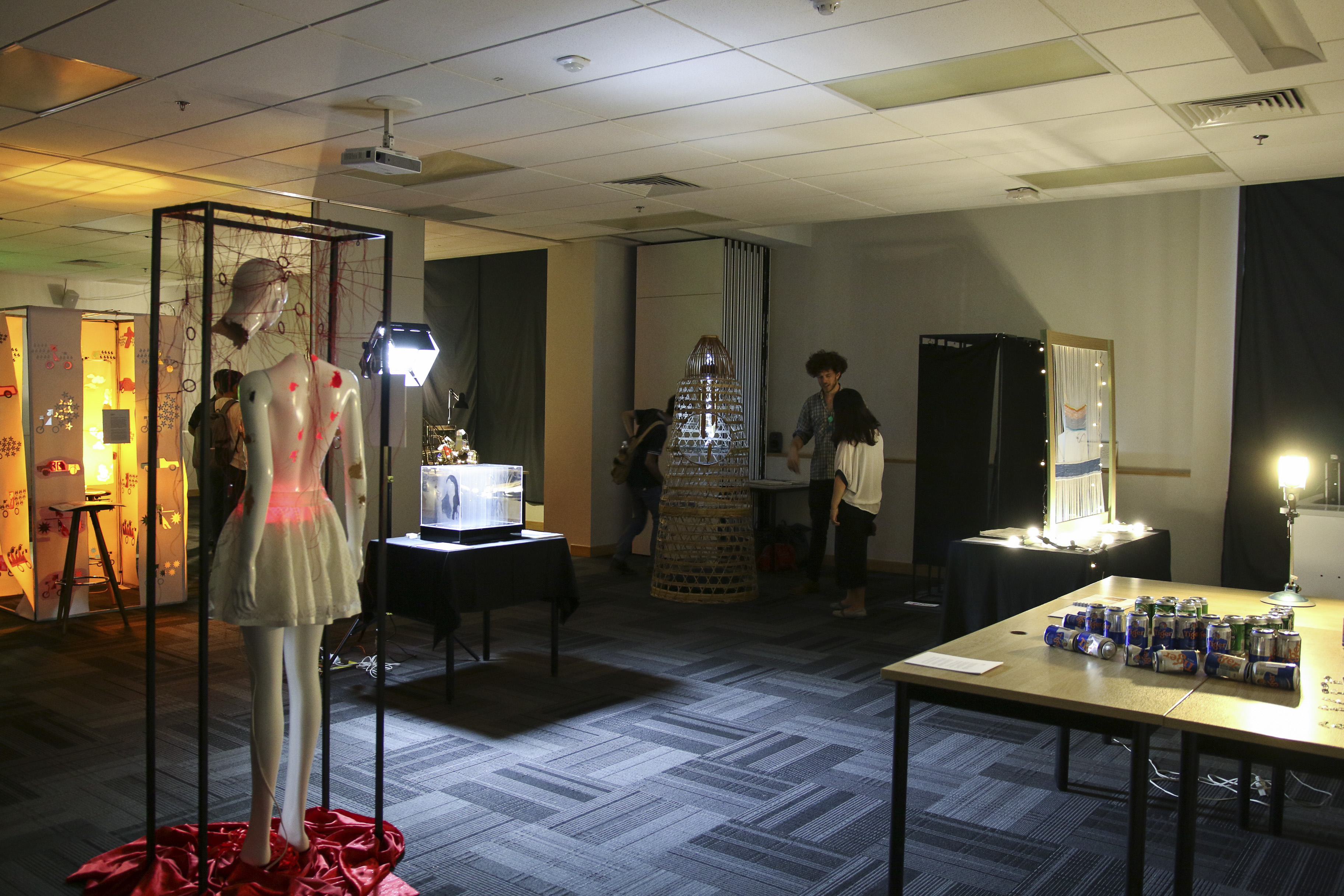 The makeshift exhibition space in a classroom was a little less-than-ideal. The work was intended for display in a darkened room to allow for silhouettes to be cast upon the walls. The lighting created by other works had not been taken into account, so this footage was taken with other works switched off when no visitors were around.